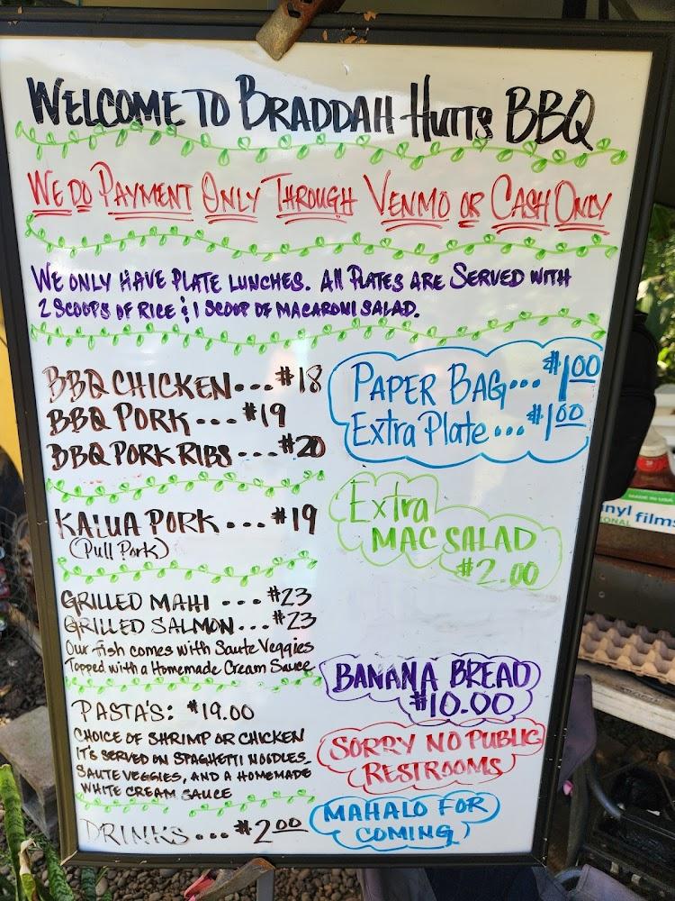 The menu at Braddah Hutts BBQ Grill features classic Hawaiian BBQ staples. BBQ chicken, pork, and ribs are standout items, all grilled to perfection. Expect to find local favorites like Kalua pork and grilled mahi mahi. Each dish represents authentic island flavors. Sides include mac salad and sautéed veggies, ensuring a balanced meal. Many dishes come at an affordable price, making it accessible to all. Vegetarian options, though limited, are available on menu. Plenty of drink choices, including local sodas, complement every meal.